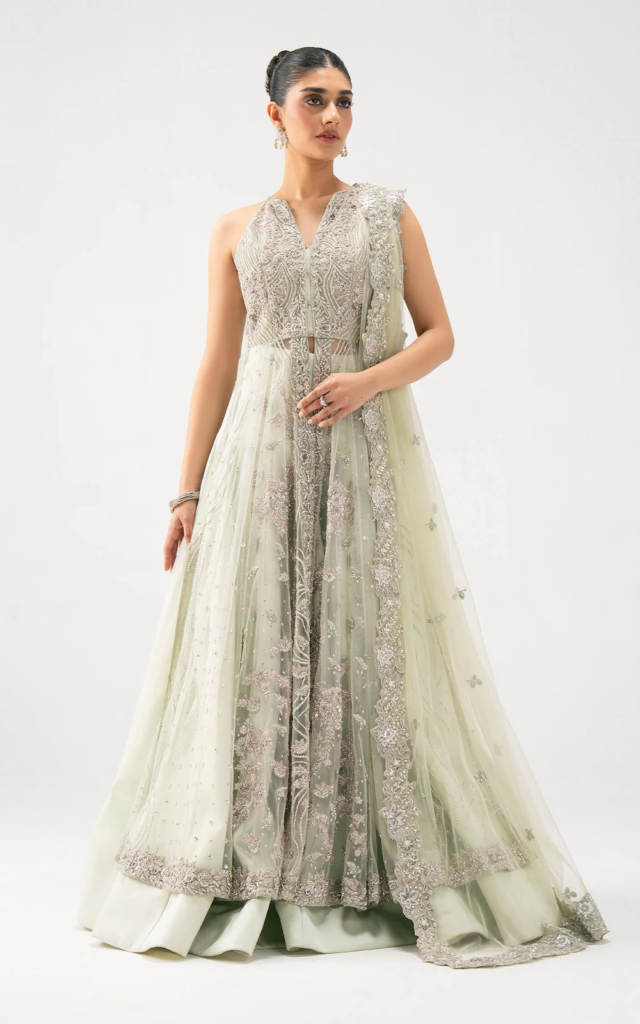 The sleeveless bodice shines with delicate resham and sequin embroidery, layered with flowing Shamoz silk for a dreamy finish. The crystal-edged dupatta enhances its ethereal charm, making it a show-stopper for receptions and engagement ceremonies.